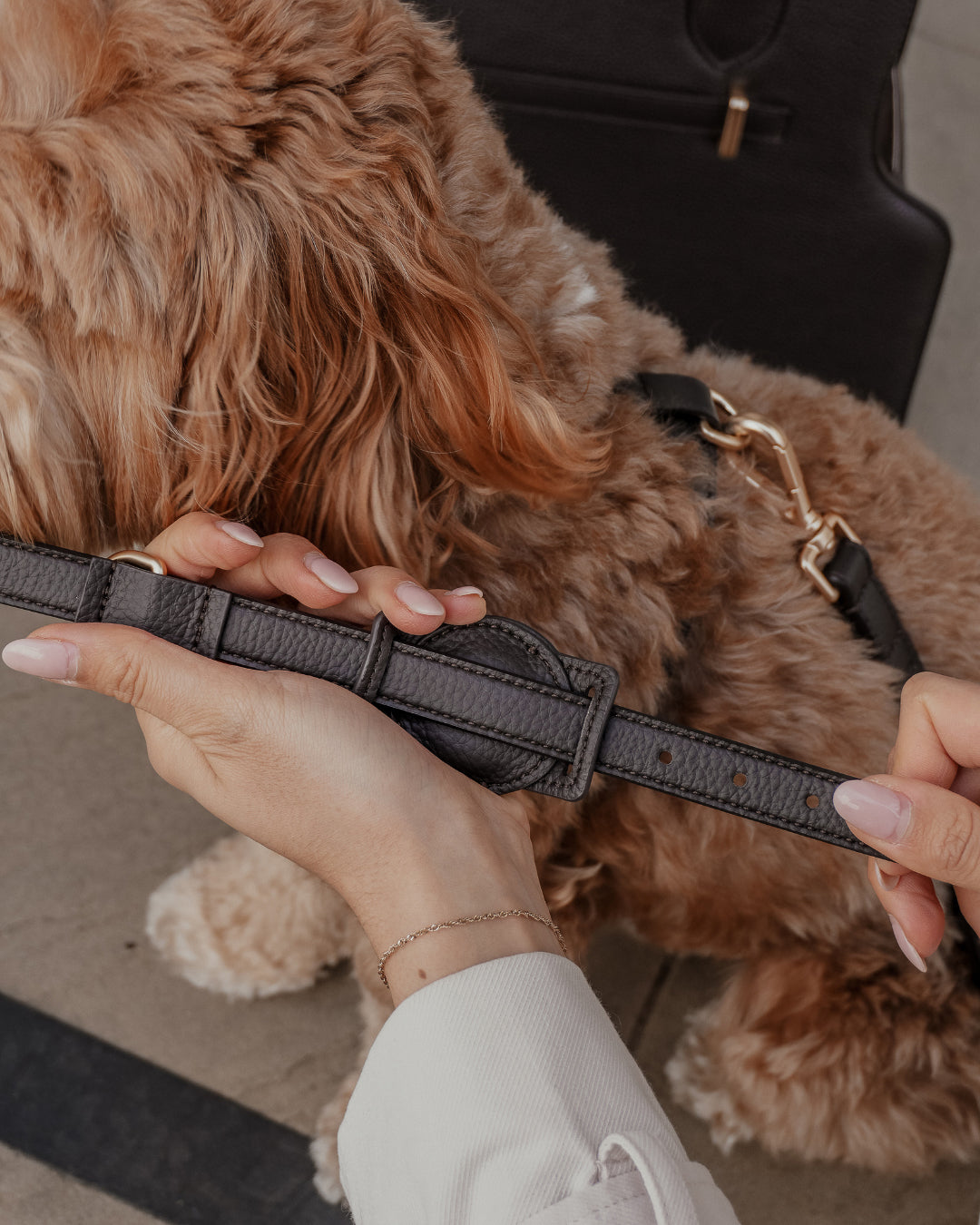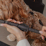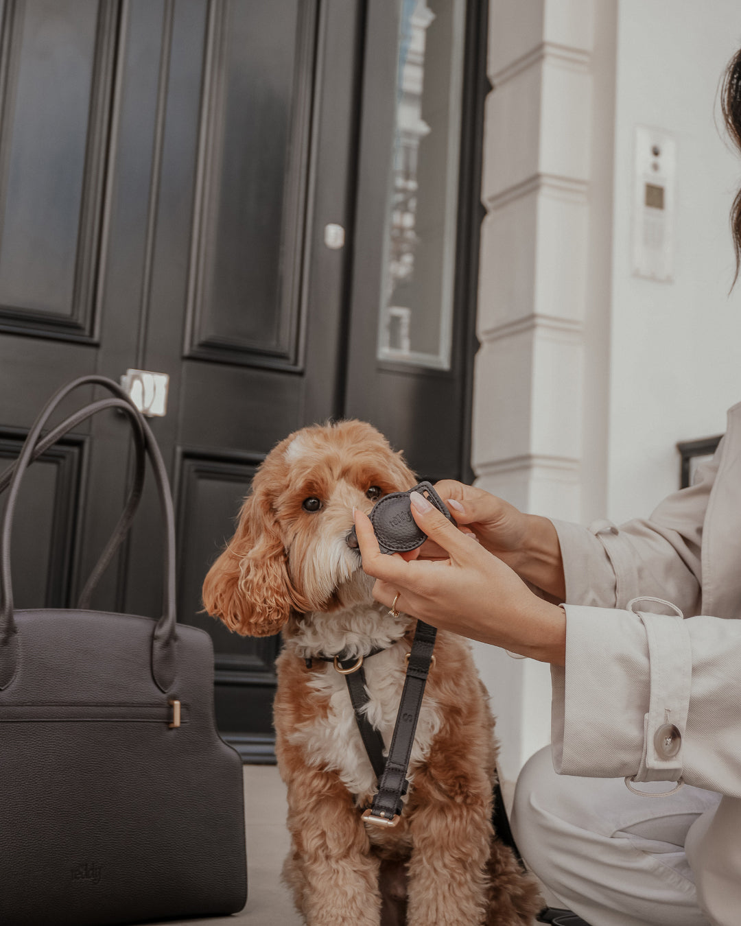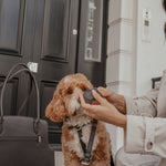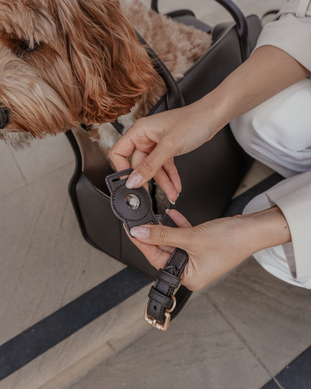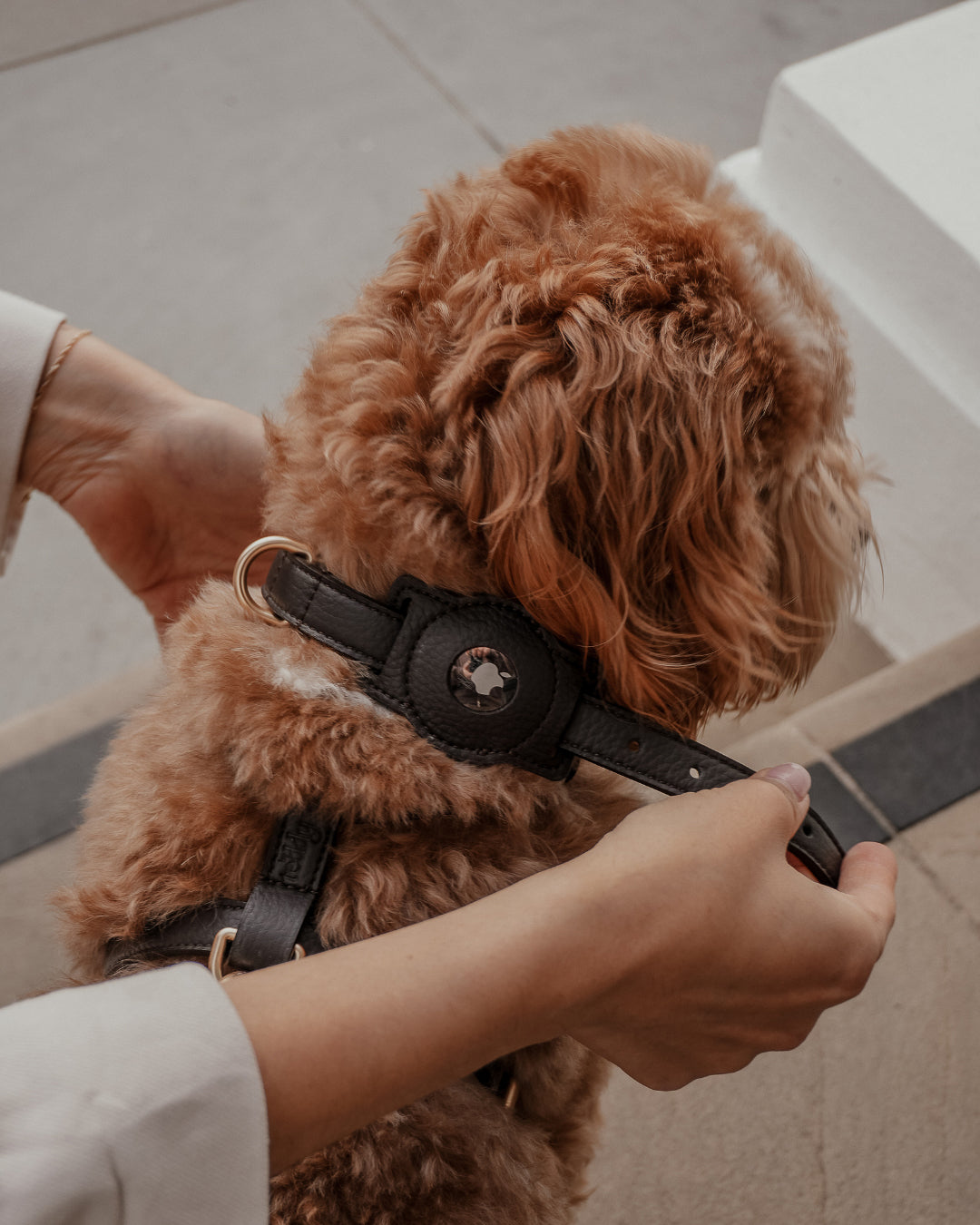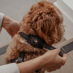 Crafted from softly padded vegan leather, it integrates seamlessly with your dog’s collar, offering a discreet and refined solution for everyday reassurance.